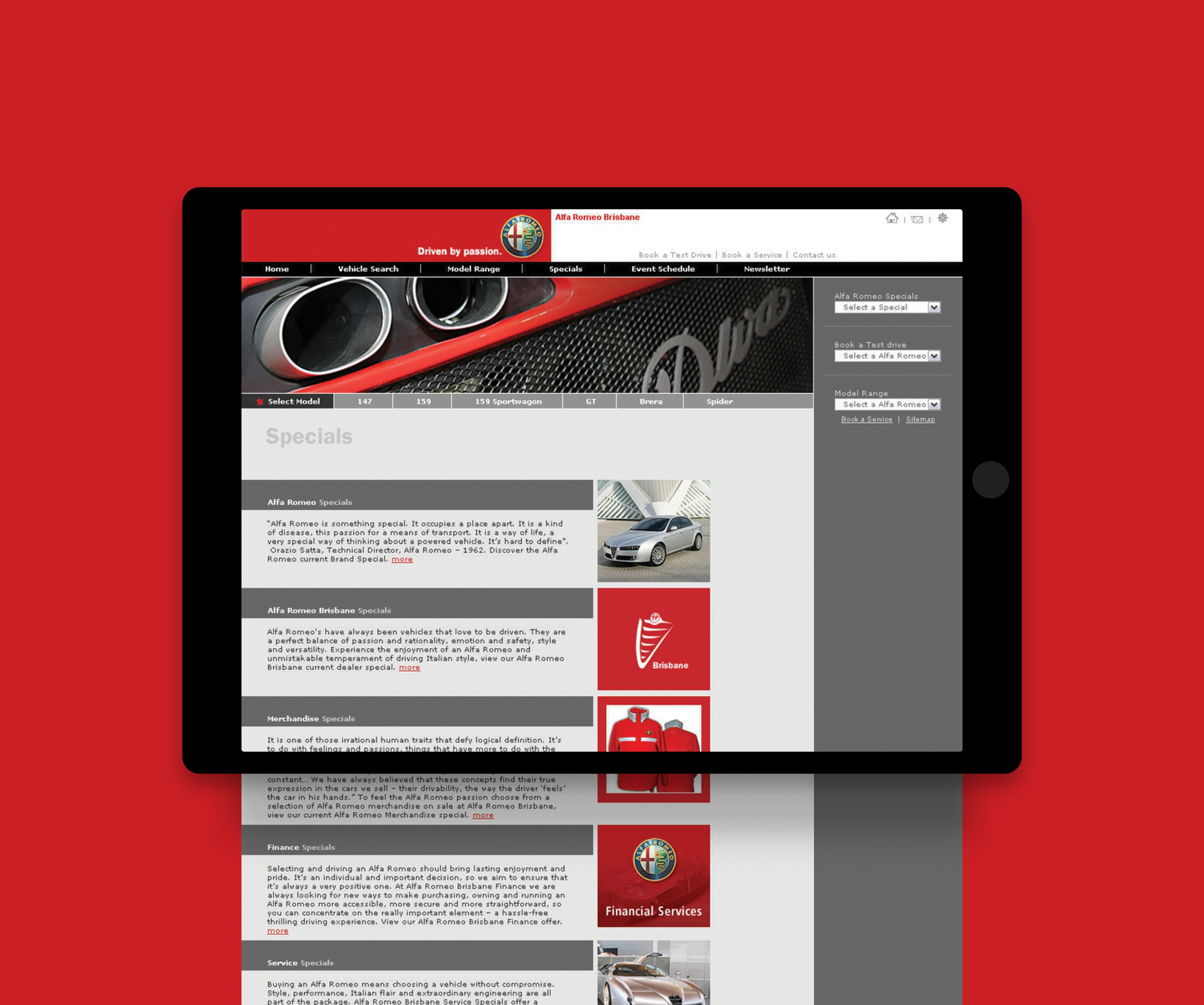 Alfa Romeo Dealership website included Dealer Profile, Pre-Owned, Demonstrator, and New Vehicles with XML data feeds from the PrestigeWay web service. The centrally managed Content Management System (CMS) enabled the Alfa Romeo Dealership to update their own content globally. News articles, on their website, were published in Google News within 6 mins of being published.